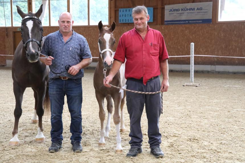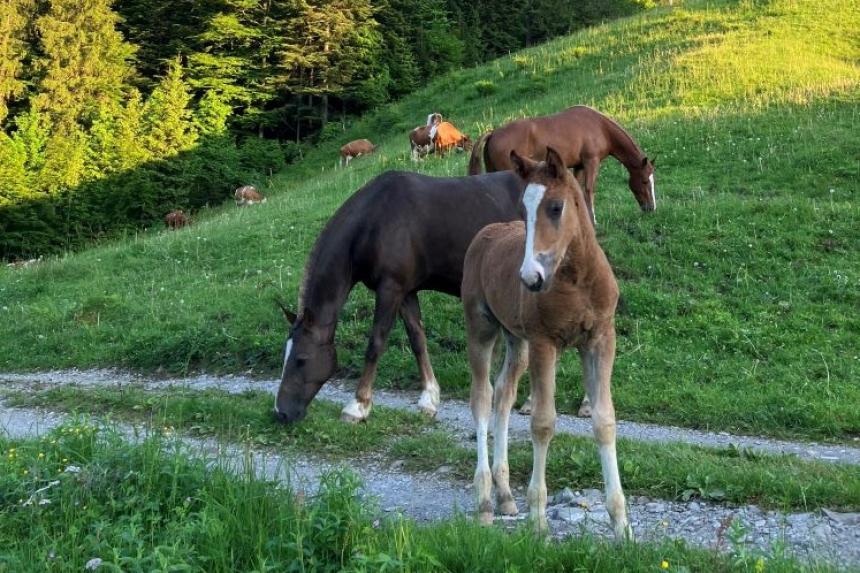 Cosmo est un poulain vif, sociable et très facile à vivre, avec une robe particulière (alezan foncé rubican). Avec sa mère (jument d’élite) et une jeune jument, Cosmo a passé ses premiers mois de vie à l’alpage, en compagnie d’un troupeau de vaches. Ce jeune poulain est très bien développé et incarne parfaitement le but d’élevage de la race FM.