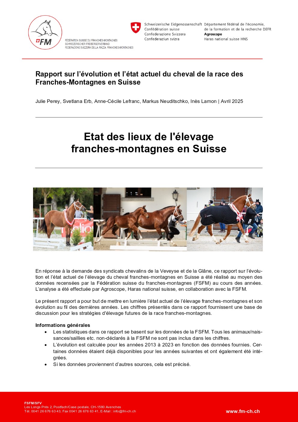 Rapport sur l’évolution et l’état actuel du cheval de la race des Franches-Montagnes en Suisse